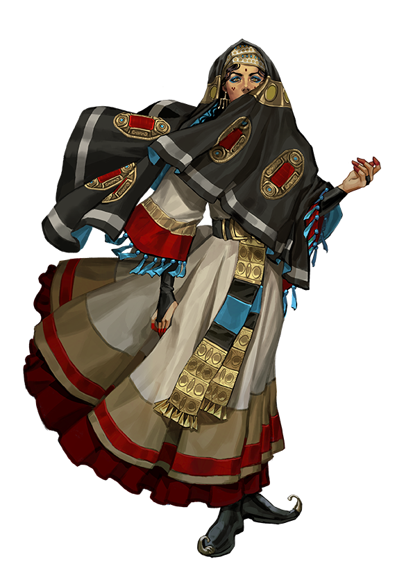Geniekin dancers enjoy the benefits of celebrity and patronage among the urban elite across the Impossible Lands. For geniekin, dance forms a narrative, and they often recreate ancient Vudrani tales with elemental flair. Performers accompany the music with ankle bells or, in places of great natural beauty, with the sounds of the elements themselves. In recent decades, geniekin dance companies have emerged, touring the Impossible Lands and spreading their cultural influence.