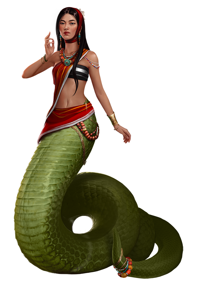 Nalinivati, who was inspired by both humans and nagas. This inspiration, alongside nagaji's devotion to nagas, has led many to claim nagaji were created to be servants. However, Nalinivati created nagaji simply for the sake of creating. She envisioned a world where nagas and nagaji worked together to succeed, with nagas serving as sacred guardians, and nagaji living as mortals upon Golarion, respecting nagas for their strength and wisdom. Nagaji live up to this expectation, forming nations, temples, and villages with as many varied governments, societies, and traditions as there are scales on a serpent's back. If nagaji can be said to share any trait, it's devotion, be it to a community, a temple, a concept, or a lifestyle. Most nagaji are also drawn to the spiritual in all its expressions, even the darker aspects of philosophies and religions.