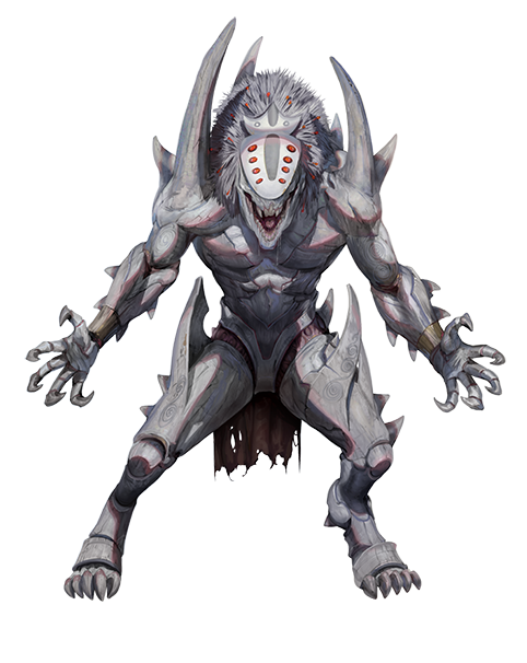 Golomas are humanoids with rough skin that ranges in color from warm brown to ebony, although sickly gray or white individuals with albinism are not uncommon. Their fingers and feet are coated with a thin layer of chitin. A goloma's face is an oblong wedge made of smooth chitin, almost resembling a wooden mask. Protruding from this face are eight gelatinous, shining eyes. A goloma's mouth and jaw are located beneath their face-plate, and a bony crest juts from the top of their chitinous visage. The back of a goloma's head and neck is coated in black hair that is filled with thousands of tiny, peering eyes. These eyes tend to glow and squirm as they look around—an unsettling sight for most.