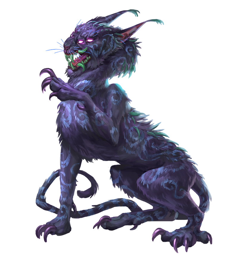 Dweomercats are magically gifted felines from the First World, where they prey upon other creatures and feed upon their primal energy. They are sometimes encountered in areas of the Material Plane where the veil to the First World is thin, or in regions where magic has been irreparably warped. Dweomercats are famous for their ability to twist the metaphorical strings of spells cast on or near them, which they can transform into their own defensive magic or tap into to instantly teleport across the battlefield.