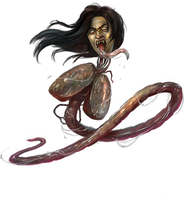 Melee [one-action] proboscis tongue +14 [+9/+4] (finesse), Damage 2d6+5 piercing plus penanggalan bileMelee [one-action] entrails +14 [+9/+4], Damage 2d4+5 bludgeoning plus GrabConstrict [one-action] 2d4+3 bludgeoning, DC 21Elongate Tongue [one-action] The penanggalan's tongue extends, the membrane stretching and becoming translucent. Until the end of the turn, the penanggalan's proboscis tongue Strikes have a 10-foot reach, and any target is flat-footed against the Strike unless it has a Perception DC of 22 or higher or the ability to precisely sense invisible things.Penanggalan Bile (disease) Rest doesn't decrease the drained value from penanggalan bile; Saving Throw DC 19 Fortitude; Stage 1 drained 1 (1 week); Stage 2 drained 2 (1 week); Stage 3 drained 3 (1 week); Stage 4 deadRide Corpse [three-actions] (concentrate, polymorph, transmutation) The penanggalan inserts their entrails into their humanoid body, allowing them to appear as and move about like a normal human. The body has 10 Hit Points and the same defenses as the penanggalan. When the body is destroyed, the penanggalan is ejected unharmed. The body becomes a corpse, and if it is neither controlled by the penanggalan nor stored in an alchemical vat, it decays as normal.