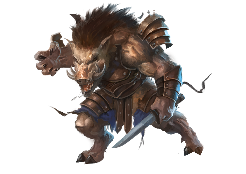 Melee [one-action] dagger +10 [+6/+2] (agile, versatile S), Damage 1d4+6 piercingMelee [one-action] tusk +10 [+5/+0], Damage 1d8+6 piercing plus curse of the wereboarMelee [one-action] claw +10 [+6/+2] (agile), Damage 1d4+6 piercingRanged [one-action] dagger +7 [+3/-1] (agile, thrown 10 feet, versatile S), Damage 1d4+4 piercingBoar Charge [two-actions] The wereboar Strides twice and then makes a melee Strike. As long as they moved at least 20 feet, they gain a +2 circumstance bonus to their attack roll.Change Shape [one-action] (concentrate, polymorph, primal, transmutation) The werecreature changes into their humanoid, hybrid, or animal shape. Each shape has a specific, persistent appearance. A true werecreature's natural form is their hybrid shape. In humanoid shape, the werecreature uses their original humanoid size, loses their jaws and claw Strikes, and gains a melee fist Strike that deals bludgeoning damage equal to the slashing damage dealt by their claw. In animal shape, their Speed and size change to that of the animal, they gain any special Strike effects of the animal that they didn't already have (such as Grab), and they lose their weapon Strikes.