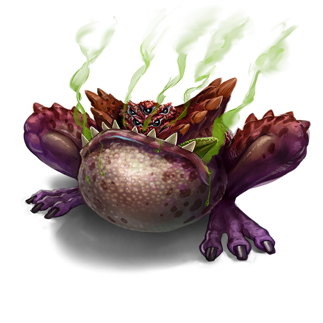 This rubbery, spheroid scavenger is nearly all acid-dripping mouth, with five bulbous black eyes and two powerful, gangly legs. A gibtas often forms a bond with a single other creature—usually, a more powerful aberration— and serves this master loyally, if erratically. Creatures who keep a gibtas as a pet or guard soon learn to keep it away from any important possessions they don't want spattered with acid.
