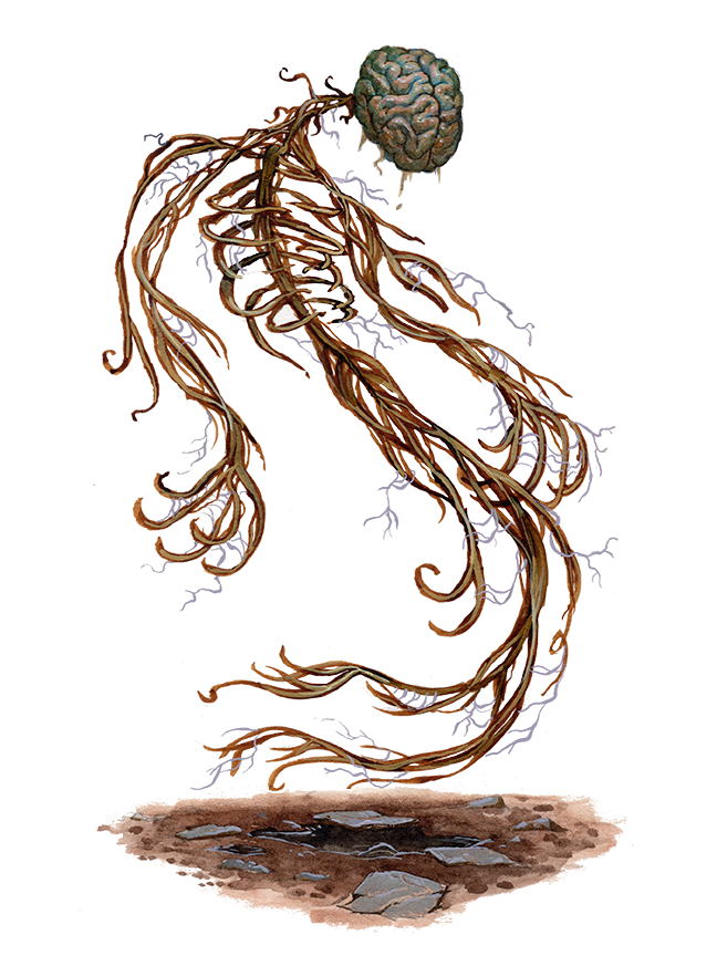 When a living creature is killed by massive amounts of electricity (such as by being struck by lightning or subjected to a magical attack), their dying terror sometimes causes their soul to linger on the Material Plane. Necromantic energy takes hold of their brain and nervous system, causing these organs to burst forth from the charred flesh and become a raw nerve. These horrific undead float a few inches off the ground in a macabre arrangement morbidly parodying the creature's living form, with its brain at the top and nerves dangling below, crackling with electrical energy.