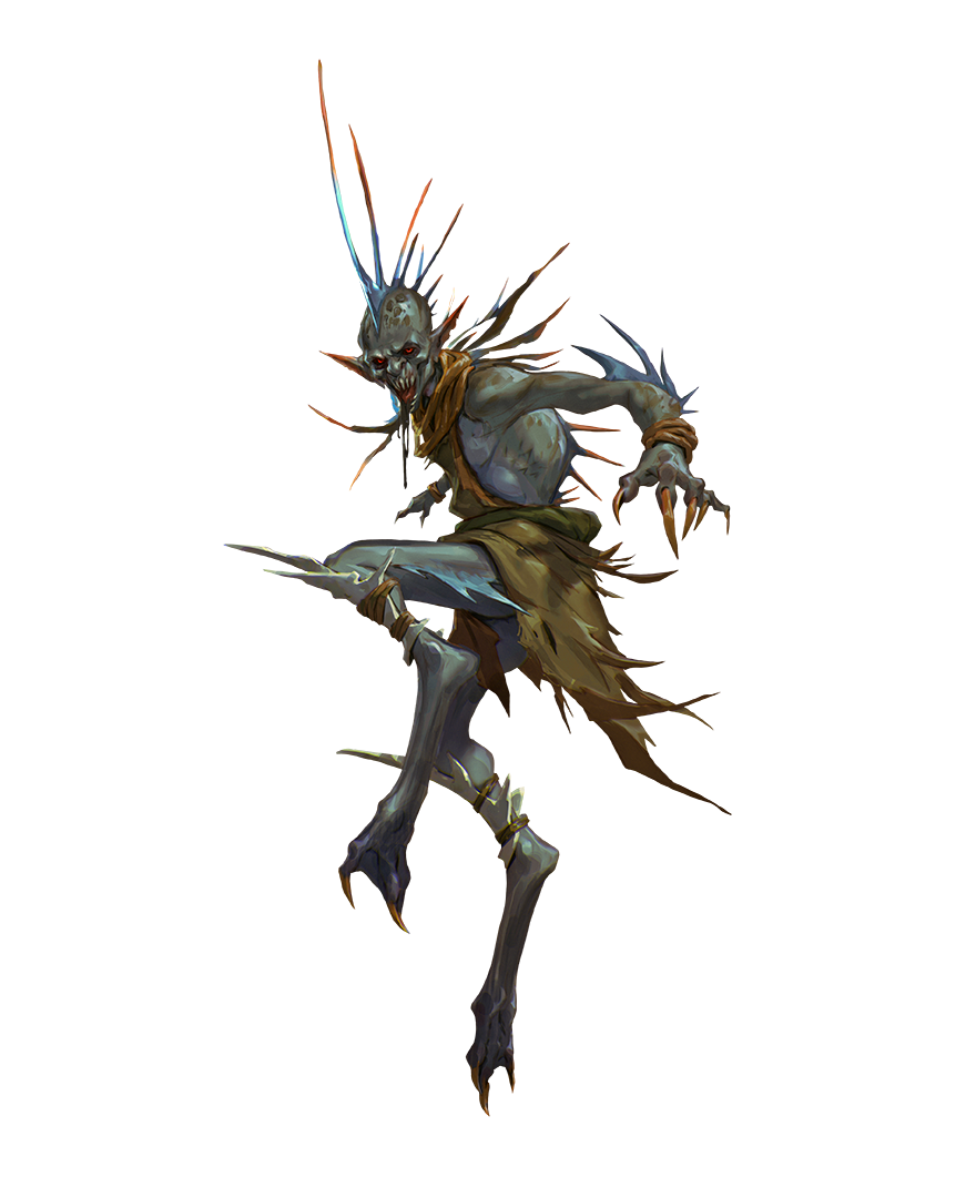 Feared by mariners and coastal dwellers everywhere, the aquatic ghouls known as lacedons are said to be the spawn of an ancient crew of sailors who became lost at sea and were forced to resort to cannibalism to survive. Their appearance is the stuff of a diver's nightmare, supplementing the vicious traits of their land-bound kin with spines, fins, and wide mouths bristling with needle-sharp teeth like piscine predators of the nethermost ocean depths.