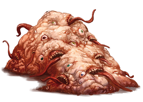 Amorphous blobs of yammering mouths and oozing, fleshy sludge, gibbering mouthers are among the strangest creatures found either aboveground or below. Perpetually ravenous, these aberrations are always seeking their next meals, ever eating but never sated. With a nominal intelligence, gibbering mouthers can understand and even speak Aklo, but they do so in an intelligible manner only rarely. Instead, their innumerable mouths constantly jabber and babble in a stream of sound that disrupts the thought patterns of other creatures in the area.