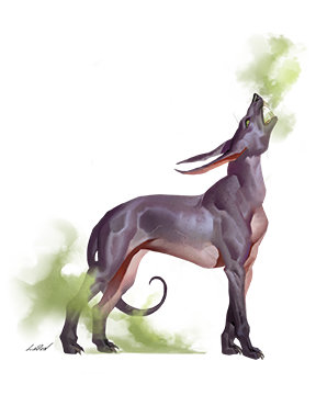 Wild hunt hounds are intelligent hunters and expert trackers that take the lead against elusive prey. Left to their own devices, they seek out creatures that are notoriously difficult to track. They are always surrounded with green mist composed of fragments of the spirits of the wild hunt's victims, a mystic fog that forms itself into a spectral pack to fight at its side.