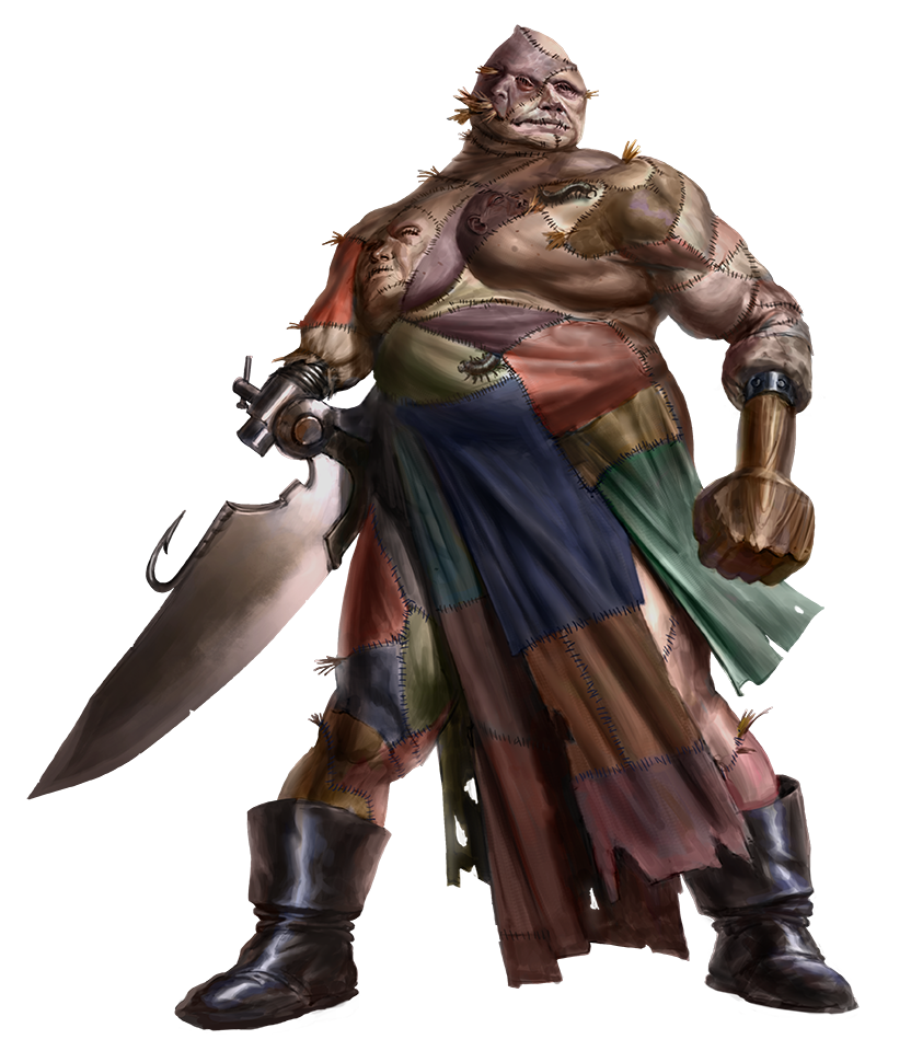 Skinstitches' hulking frames are made from flayed humanoid skin stuffed with straw and poisonous insects. The dark god Norgorber grants the secrets for creating these monstrosities in disturbing dreams to select followers, informally referred to as skinstitchers.