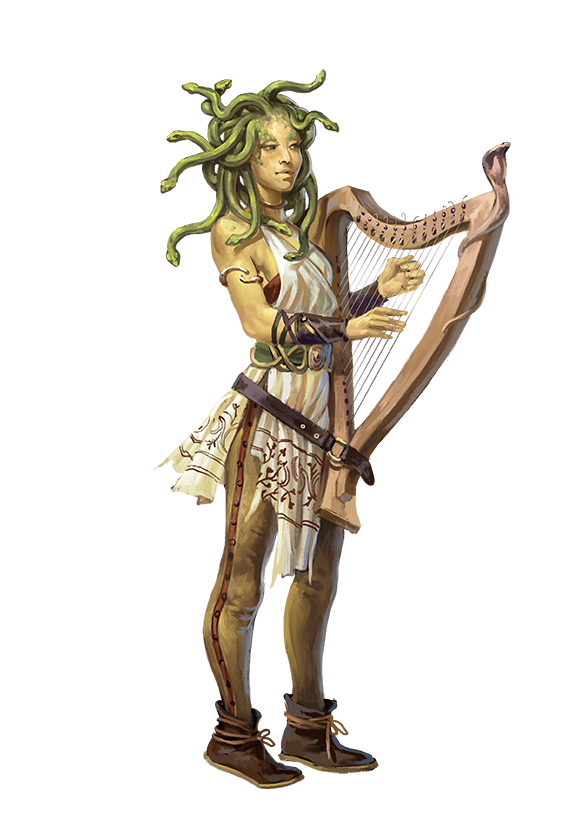 With living snakes for hair, sthenos, who are descended from medusas, are a curious and independent ancestry. A newly emergent people, sthenos have existed for just barely over a century. Only a few generations have passed since their genesis, and some adult sthenos remember members of the original generation. Indeed, since sthenos can live about as long as humans, a few of the original sthenos might yet live somewhere. As a people without a traditional homeland, sthenos seek to find societies that welcome them, which can be a challenging endeavor. With more than a passing resemblance to medusas, given their ophidian hair and striking features, they find most places are wary if not outright hostile to their presence.