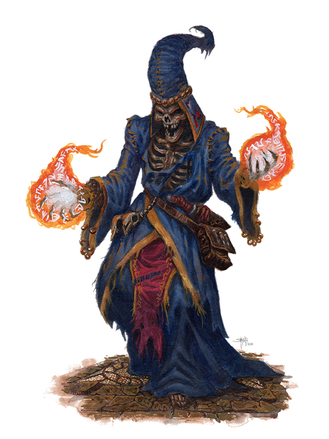 Rarely, the bones of a spellcaster can be used to create a skeleton that retains a limited ability to cast spells. These spells are almost always offensive in nature, and the skeletal mage uses them with reckless abandon. Skeletal mages are often misidentified as liches, and while not nearly as cunning or deadly, they still pose a significant threat to their foes.