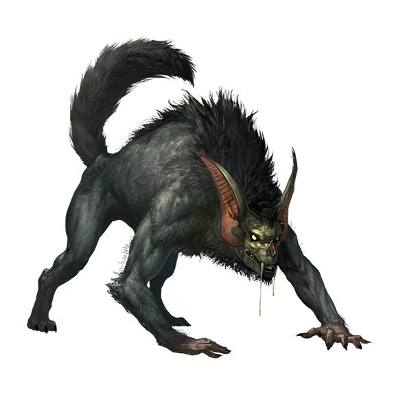 Barghests are lupine fiends with goblinoid faces and humanoid hands. They stalk the Material Plane in search of souls to sate their demonic hunger. Eons ago, barghests dwelled in the pits of Hell and served Asmodeus, but after Lamashtu abducted and adopted the four most powerful of their kind to serve as pets (and in time, as a pantheon of hero-gods worshipped by evil goblins), barghests’ loyalties and philosophical nature changed significantly. Today, while barghests retain their connection to goblinoids, they serve none but their own appetites.