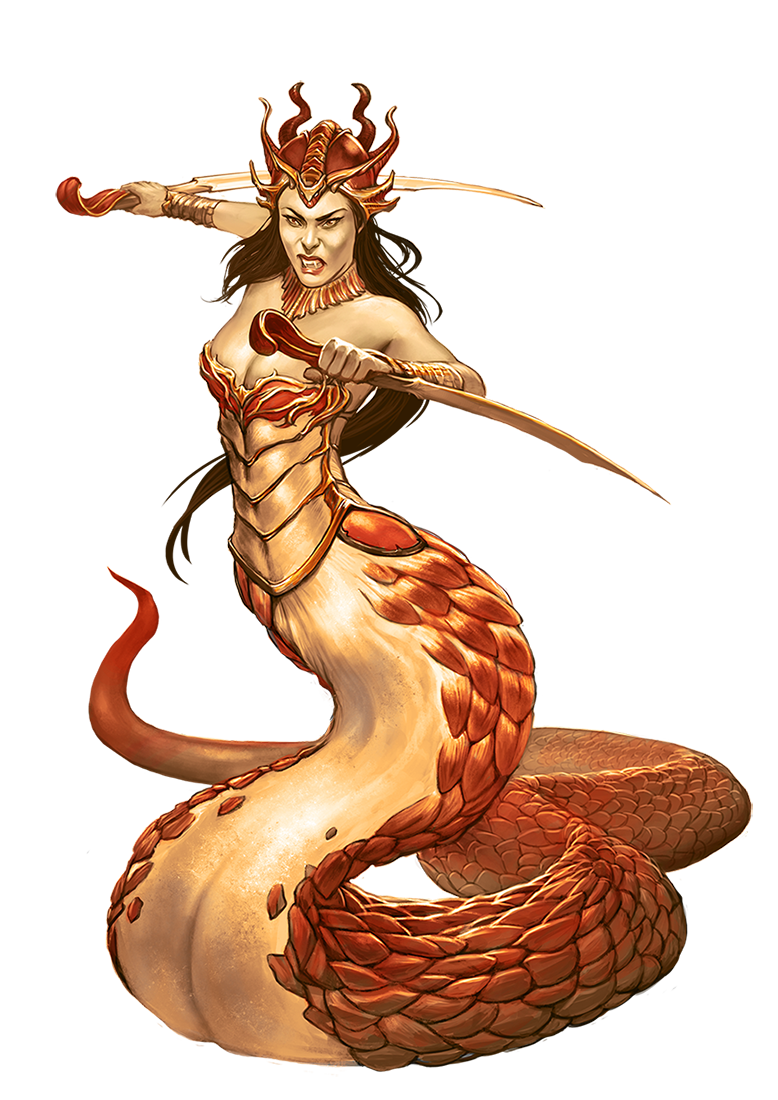 The brilliant and powerful lamia matriarchs possess boundless ambition, always seeking to bring more people and territory into the clutches of their kind. Consequently, the become rulers of other lamia. For all their cruelty toward other creatures, they’re fierce protectors of other lamia, and consequently they quickly come to rule cults or warbands. Regardless of the lamia’s gender, these ascended lamias are always known as matriarchs. Rather than leonine limbs, a lamia matriarch’s lower body is formed in the winding coils of a giant snake. They’re also set apart by the occult power they pursue, and some have even have grand designs to break the animalistic curse that transformed them. However, every attempt so far has led to the matriarch’s fall.