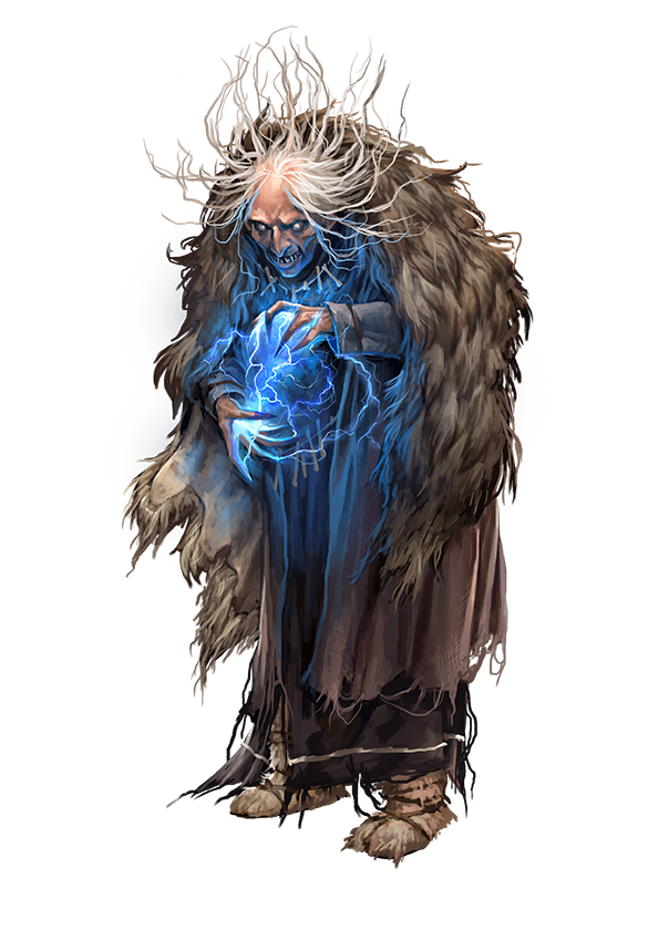 Storm hags are the personification of a storm's rage. These crones hate those who huddle together with loved ones in warm, dry shelters while the wind howls and rain lashes the land and sea. Storm hags use their powers to wreak havoc on communities near the coastal caves or hovels where they often live.
