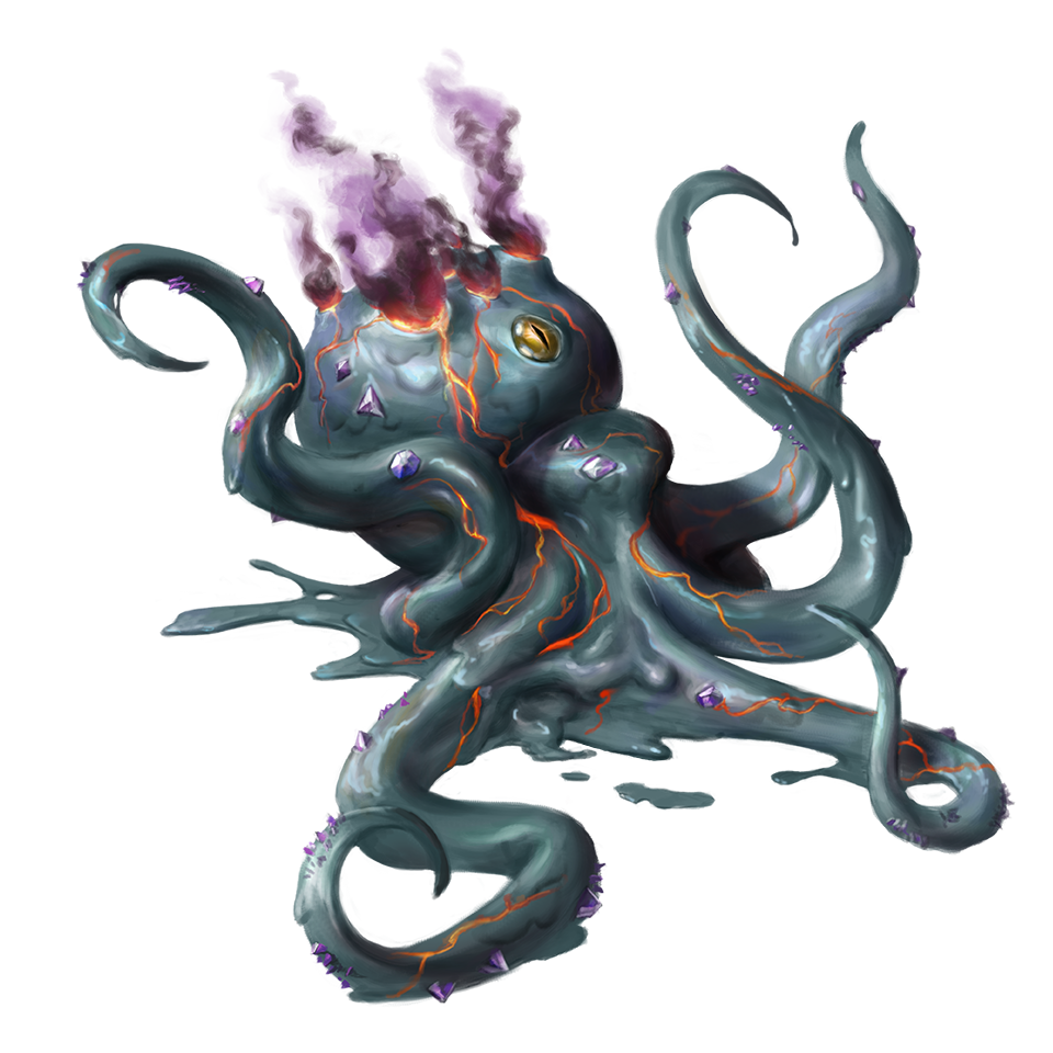Mhar, an ancient evil deity of caverns, mountains, and volcanoes, belongs to the pantheon of the Great Old Ones—monstrous beings of alien intellect and unfathomable power. The so-called children of Mhar (known as deghuuns in the chaotic tongues of Mhar's enraptured cultists) physically resemble blue-gray octopods made of stone, mud, and molten iron. Venthole-like craters dot the surface of a deghuun's body, through which the creature can gaze out with a single golden eye that it can move from crater to crater.