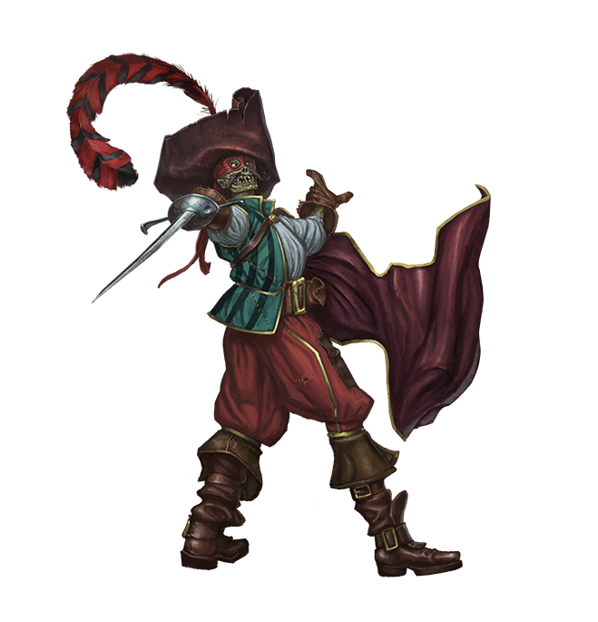 When a skilled duelist is killed, on occasion they rise as a cadaverous rake, refusing to let death get in the way of daring deeds. Appearing as a corpse-like version of their living form, a cadaverous rake retains their memories and much of their personality. The first act of many cadaverous rakes is to pay a surprise visit to family and friends, unveiling their revival. If they're met with revulsion or attempts to lay them to rest, the rake typically lashes out at the perceived betrayal or departs in offended confusion. Cadaverous rakes who are appropriately feted by friends and family often retain an affection and attachment, becoming undying protectors. This isn't necessarily a good thing, however, as the cadaverous rake's undead worldview creates impossible demands. The transition to undeath corrupts previously benevolent individuals, and their single-minded focus on finding more opponents to duel cuts a bloody swath across stretches of countryside they once protected. Rarely, those who were especially virtuous retain some of their moral code, though even then their dispositions are mercurial. All, however, retain the flamboyance and swagger that made them notable in life, as quick with a quip as they are with a blade. The impulse to toy with their opponents becomes the undoing of many an overconfident rake.