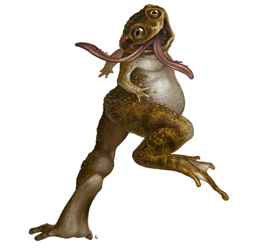 The groplit is a squat little animal shaped like a water droplet, with a bulbous rear end and an eel-like face that juts from a narrow skull. Its rear legs are more muscular than those in front, which it primarily uses for balance, giving it the gait and appearance of a toad. Groplits are best known for their greasy skin and queasy hygienic habits: they spend most of each day using their two long tongues to slurp up their own oily excretions or similarly viscous discharge originating from plants or other animals. Although they prefer to dwell in northern wetlands, fens, and moist caves, groplits can thrive in all but the most barren environments. They'll eat just about anything, though they tend to prefer small, crunchy animals like bugs and birds.