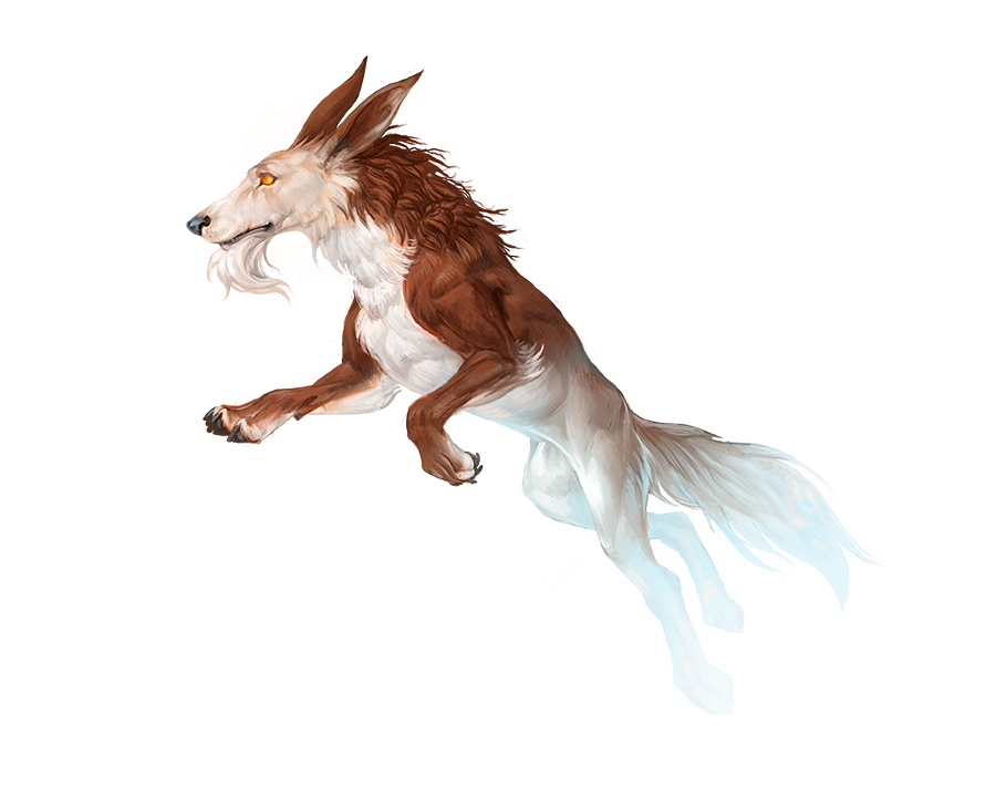 At first glance, blink dogs seem to be little more than long-eared, bearded canines with tawny coats. Yet their intelligent eyes and the blue nimbus of energy that dances across their fur hint at not only the blink dog's inherent intelligence, but also of their connection to the occult energies and mysteries that hide beyond the sight of the untrained eye. These honorable creatures are as intelligent as most humanoids. They live and hunt in large packs, roaming forests, plains, and the hidden places of the world in hunt for evil creatures—particularly those that dwell in the depths of the Ethereal Plane.