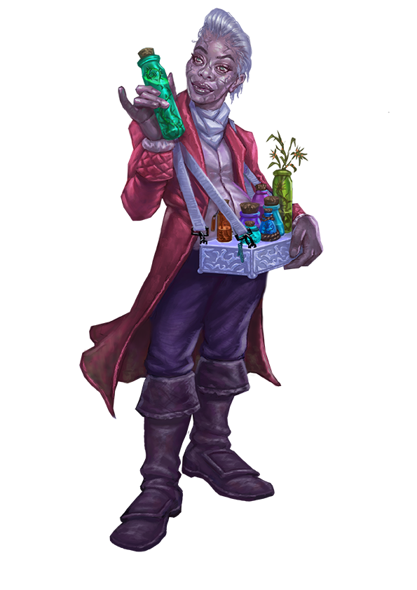 While the typical snake oil salesperson seeks riches, some medical fraudsters become so enamored with the swindler lifestyle they reanimate to keep living the lie. Known as ichor slingers, these cadaverous alchemists disguise themselves to walk among the living. There they gleefully concoct tonics and peddle cure-alls, charismatically convincing bystanders to overlook questionable ingredients and credentials. Ichor slingers feed on others' attention and trust, caring little for clients' health so long as buyers imbibe the offered medicines. Conversely, rejection infuriates ichor slingers. The undead often stalk, subdue, and administer unwanted medicines to those who snub them. When not selling “panaceas,” ichor slingers harvest macabre ingredients to make dubious new medicines.