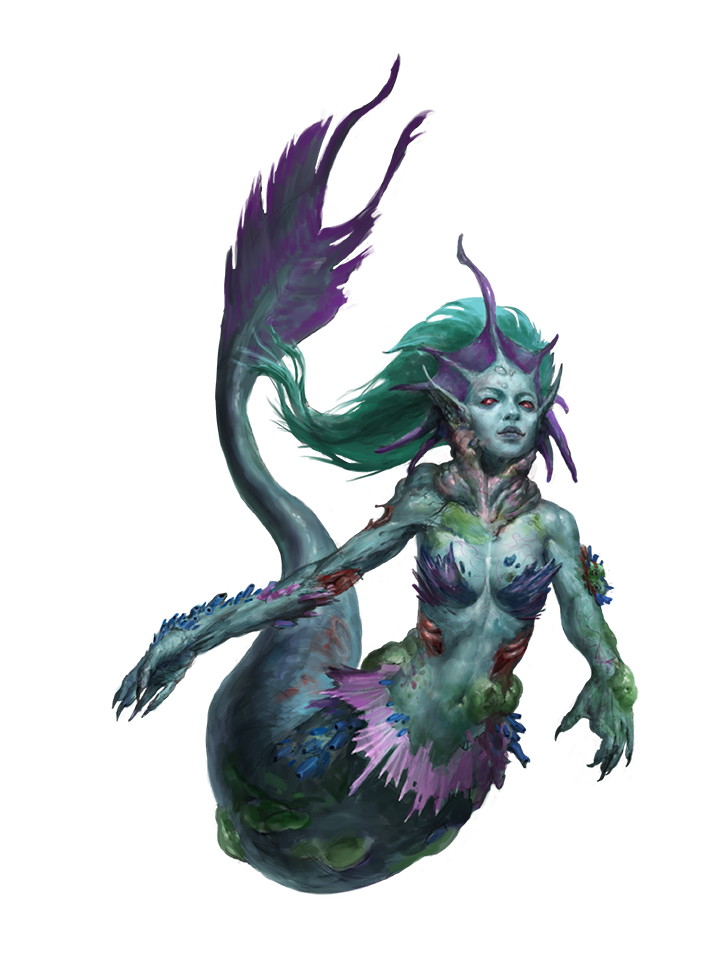 Obrousians are recognizable as the merfolk they once were before they died, though their bodies show obvious decay and their hands have elongated into sharp claws. Their voices are melodic and entrancing, belying their rotting bodies and turbulent minds, so some obrousians hide in tall reeds or under docks before speaking to their victims, lulling them into false comfort with a pleasant voice.