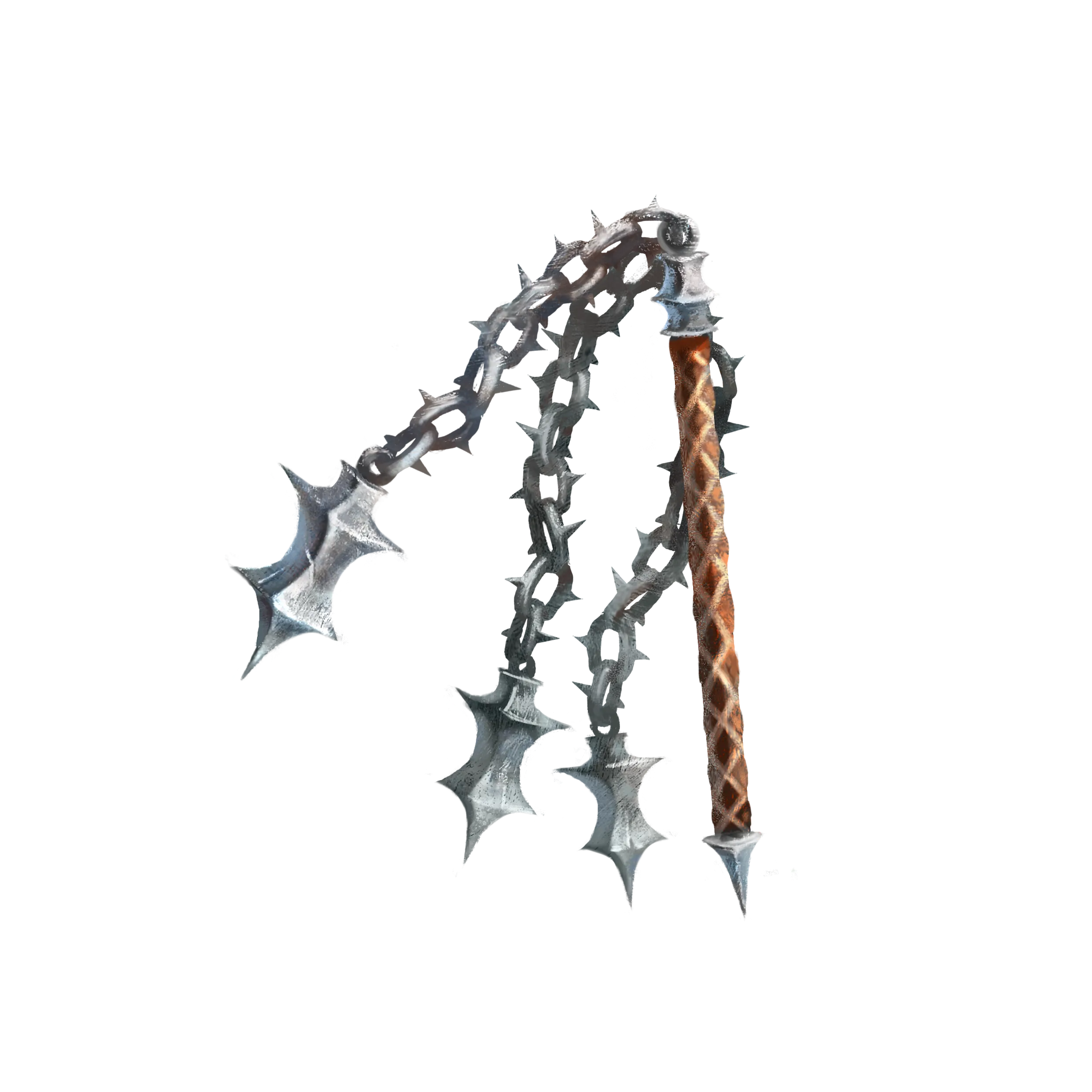 This large flail has a long shaft connected to a shorter piece of stout wood or metal that’s sometimes inlaid with spikes.